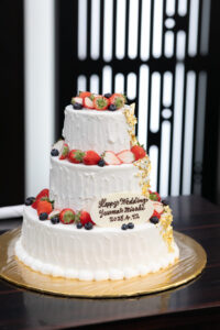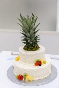 ケーキの周りには、苺やキウイ、パイナップルの果肉など色鮮やかなフルーツが散りばめられ、南国リゾートを思わせるトロピカルな印象に。シンプルながらも大胆なデザインは、おふたりらしいユーモアとセンスを感じさせます。