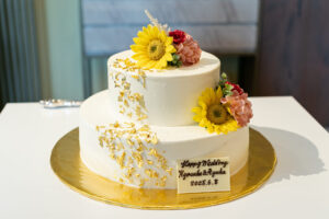 ➍純白の二段ケーキに鮮やかなひまわりが映える、夏の祝宴にぴったりのウェディングケーキ