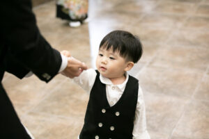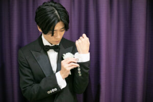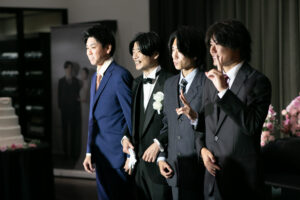 新郎様のブラックタキシードも、今のトレンドを押さえた洗練された着こなしで、