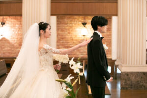 お互いの姿を目にした瞬間、新婦様の目から自然と涙がこぼれ、新郎様も優しい笑みで応えられました。