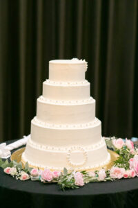 存在感たっぷりの高さにこだわった5段ケーキは、アラザンがアクセントになった“シンプル×上品”なデザイン。