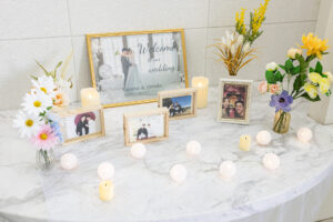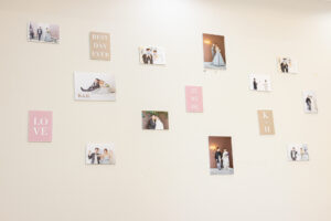 受付スペースの壁やテーブルには、おふたりの大切な思い出写真をたっぷり飾ったり、