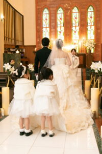 新婦様がバージンロードを歩かれる際、純白のベールをそっと持ち上げながら歩く“ベールガール”。