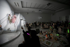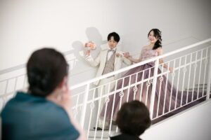 新郎新婦様が階段の上から姿を現した瞬間、会場中の視線が集まり、まるで映画のワンシーンのような華やかさに包まれます。